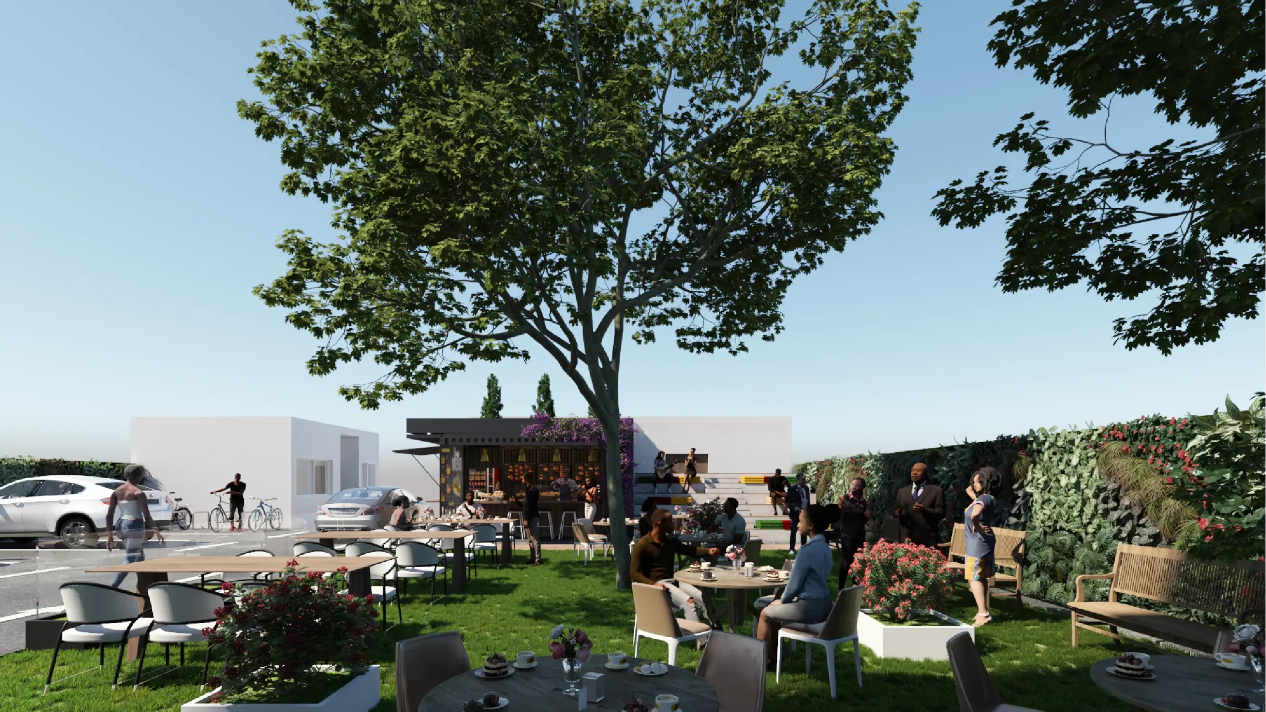 The office café kiosk sits within a relaxing garden, providing a tranquil escape. Throughout the day, visitors and tenants can enjoy a bite to eat here or in the main cafeteria at the rear of the building.